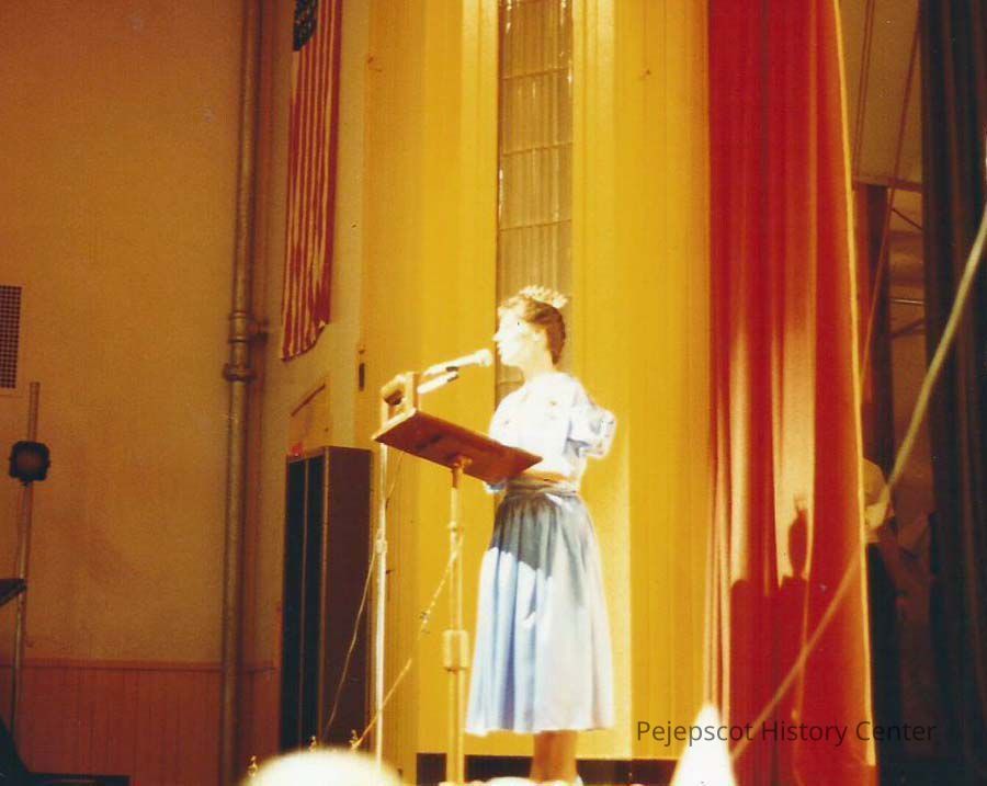 A color photograph of Teen Queen 1975 Phyllis Gaudreau Glenn introducing Crystal Hurd Teen Queen 1990 to MC the talent presentation.