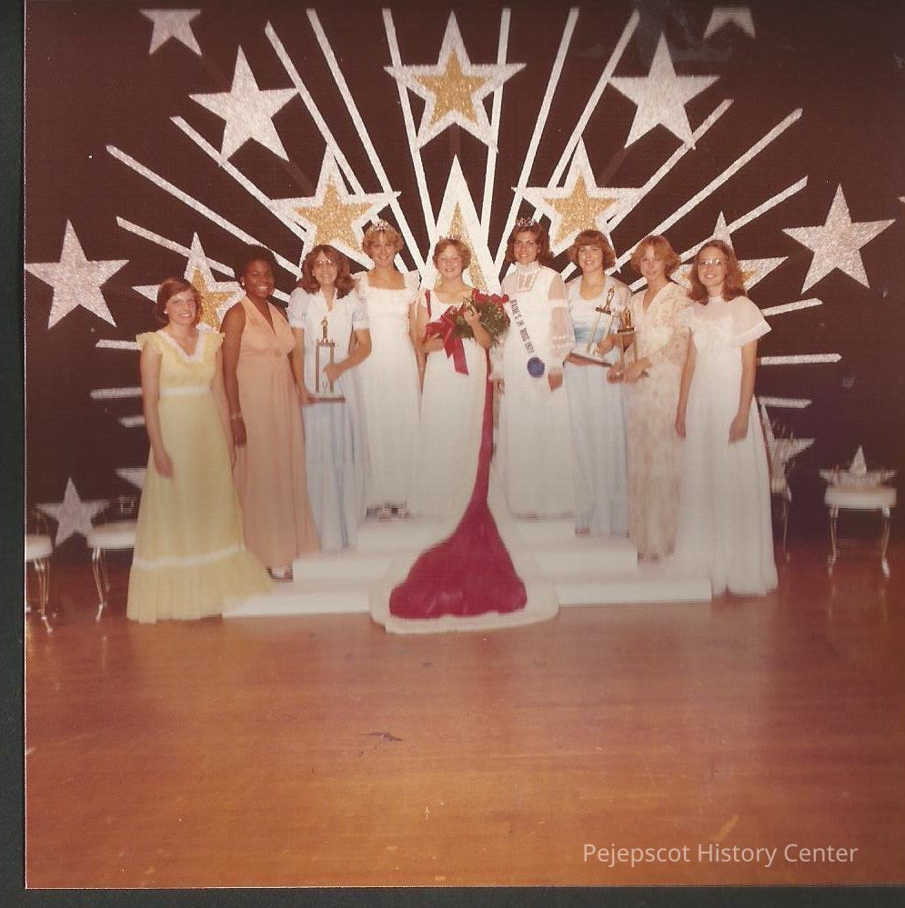 Teen Queen and her court L. to R. Joanne St. Pierre, Darren Duncan, 1st runner-up Kathleen Gamache, 1976-77 Teen Queen Becky beck, 1977-78 Teen Queen Shannon Crane, 1977 Maine Jr. Miss Kathy Gilbert, 2nd runner-up Susan Davis, 3rd runner-up Sarah Stark and Julie Stanton.Collection