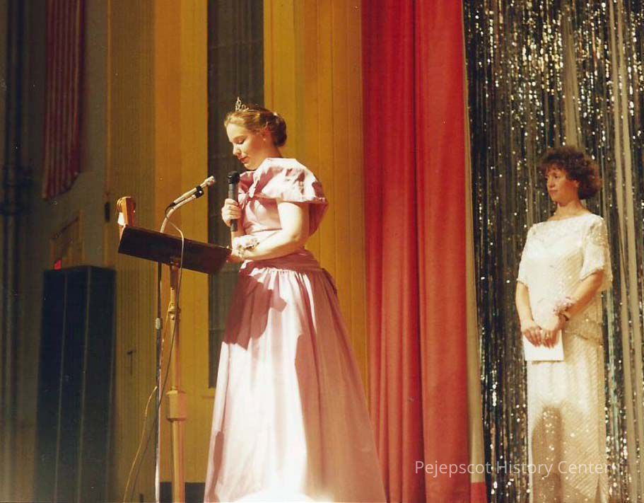 A color photograph of Teen Queen Darby Labbe giving her farewell address with Sharon Looking on.