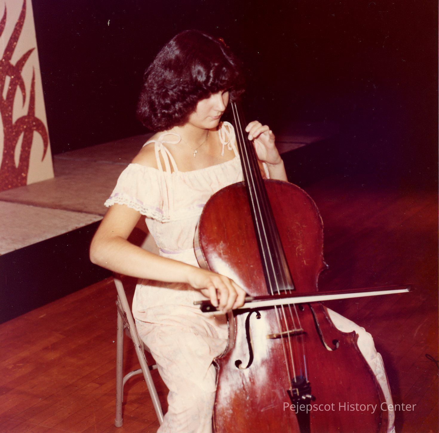 Brunswick Teen Queen Pageant, 1979. Contestant #5, Paulette Racine, playing her cello for her talent presentation at dress rehearsal.Collection
