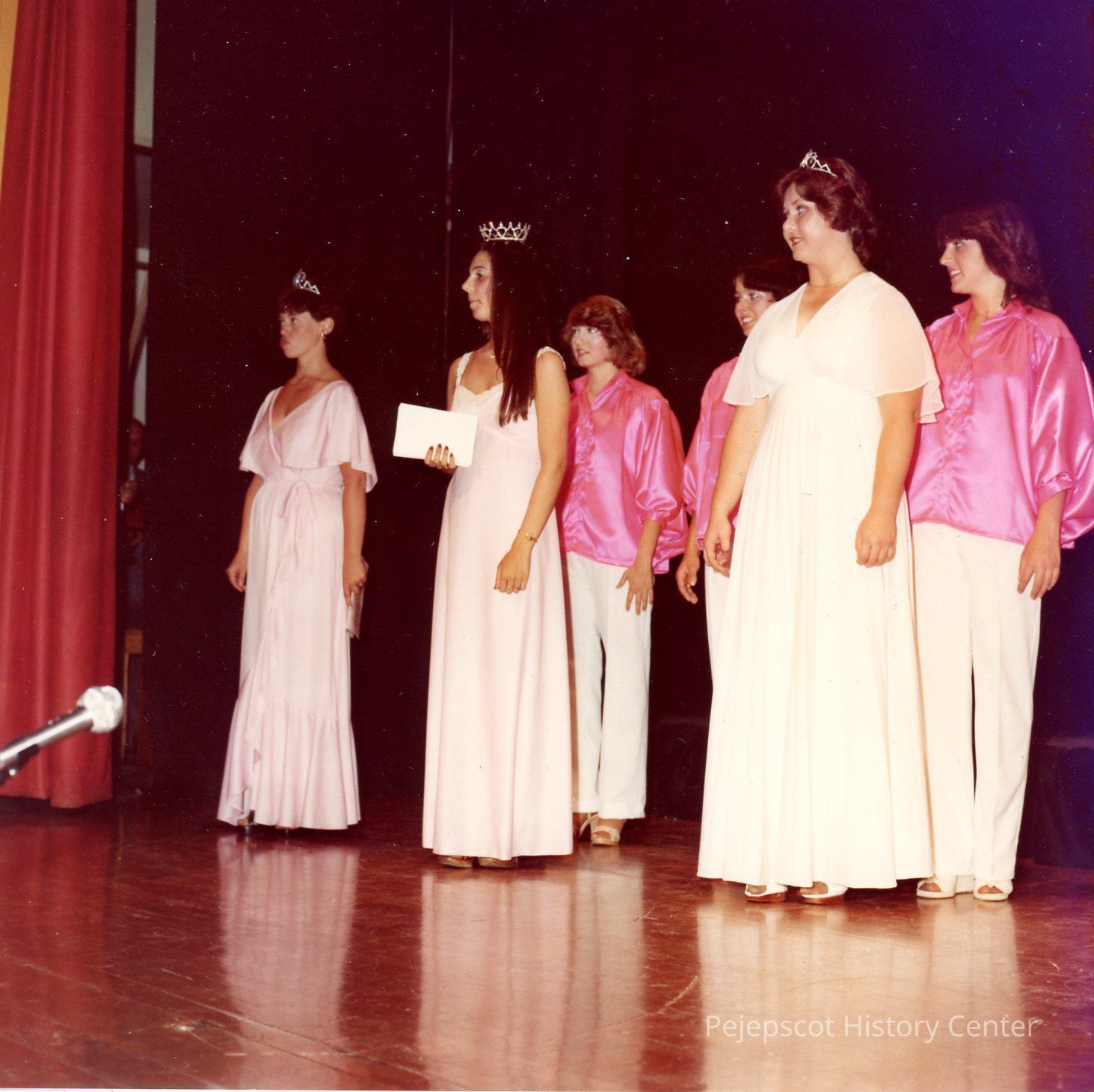 Brunswick Teen Queen Pageant, 1979. Front left to right: Sharon Hinckley, Phyllis Gaudreau, Lisa Grasmuck. Back left to right: Contestants Ginger Smith, Stephanie Davis and Rita Thiboutot listening to Miss Maine give her message.Collection