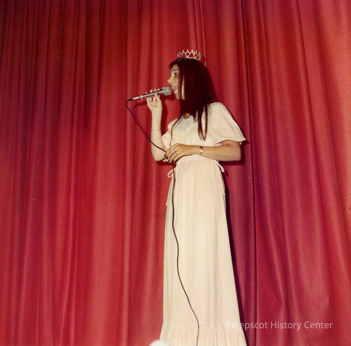 Brunswick Teen Queen Pageant, 1979. Phyllis Gaudreau, Co-Mistress of Ceremonies, singing a song called "Will You Still Love Me Tomorrow."Collection