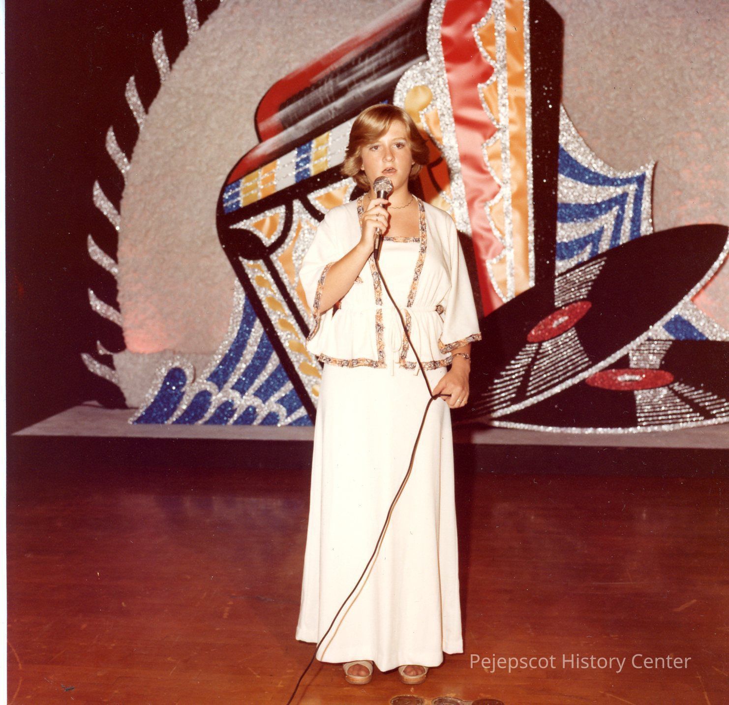 Brunswick Teen Queen Pageant, 1978. Patti Moeller at dress rehearsal practicing her vocal selection.
