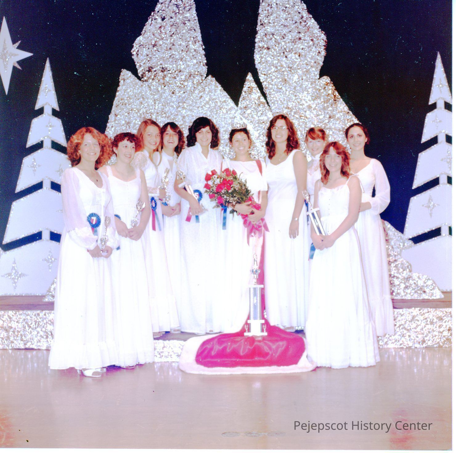 Brunswick Teen Queen and her court from left to right Lisa Hebert, Heidi Heintz, Wendy Brown, Rita Thiboutot, Paulette Racine, 2nd runner-up, Teen Queens Stephanie Davis and Cathy Lyden, Ginger Smith, 1st runner-up, Lucie Morin, Miss Congeniality, and Kristie Kaknes.Collection