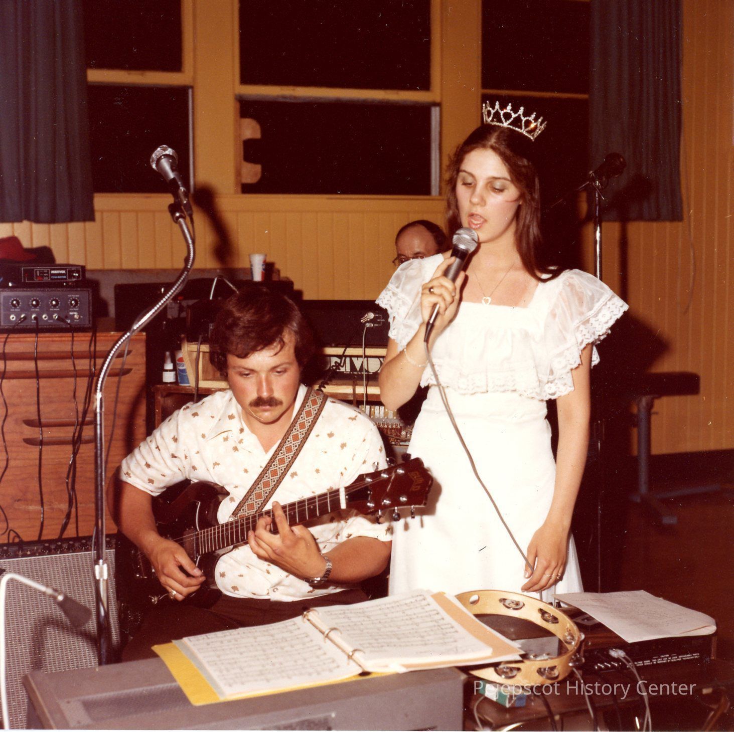 Brunswick Teen Queen Pageant, 1978. Phyllis Gaudreau singing "Puppy Love" and "Tammy" after gown competition. Accompanied by Music Express, Kenneth Fortin on the left and Chanel Fortin in the back.