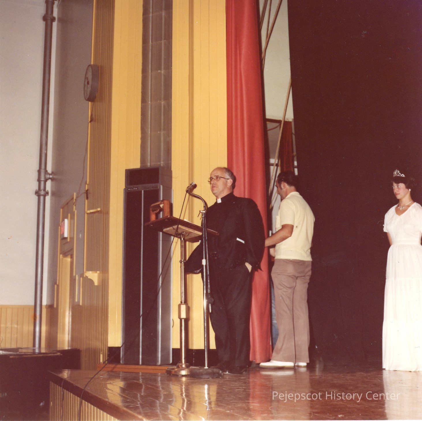 Brunswick Teen Queen Pageant, 1978. Father Emile Guilmette saying a few words to the audience and his farewell to them. Gene Gagne and Sharon Hinckley in the background.