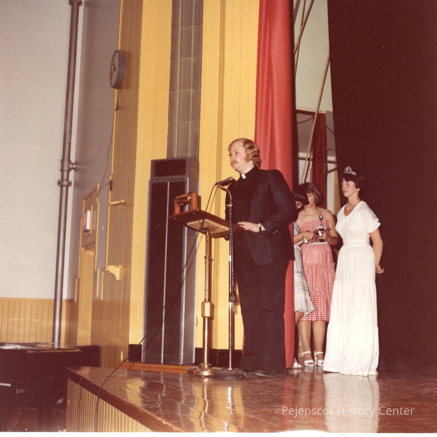 Brunswick Teen Pageant. 1978. Brother Phil Parent CYO Moderator saying a few words to the audience and presenting trophies to the non-finalists. Sharon Hinckley is in the background.