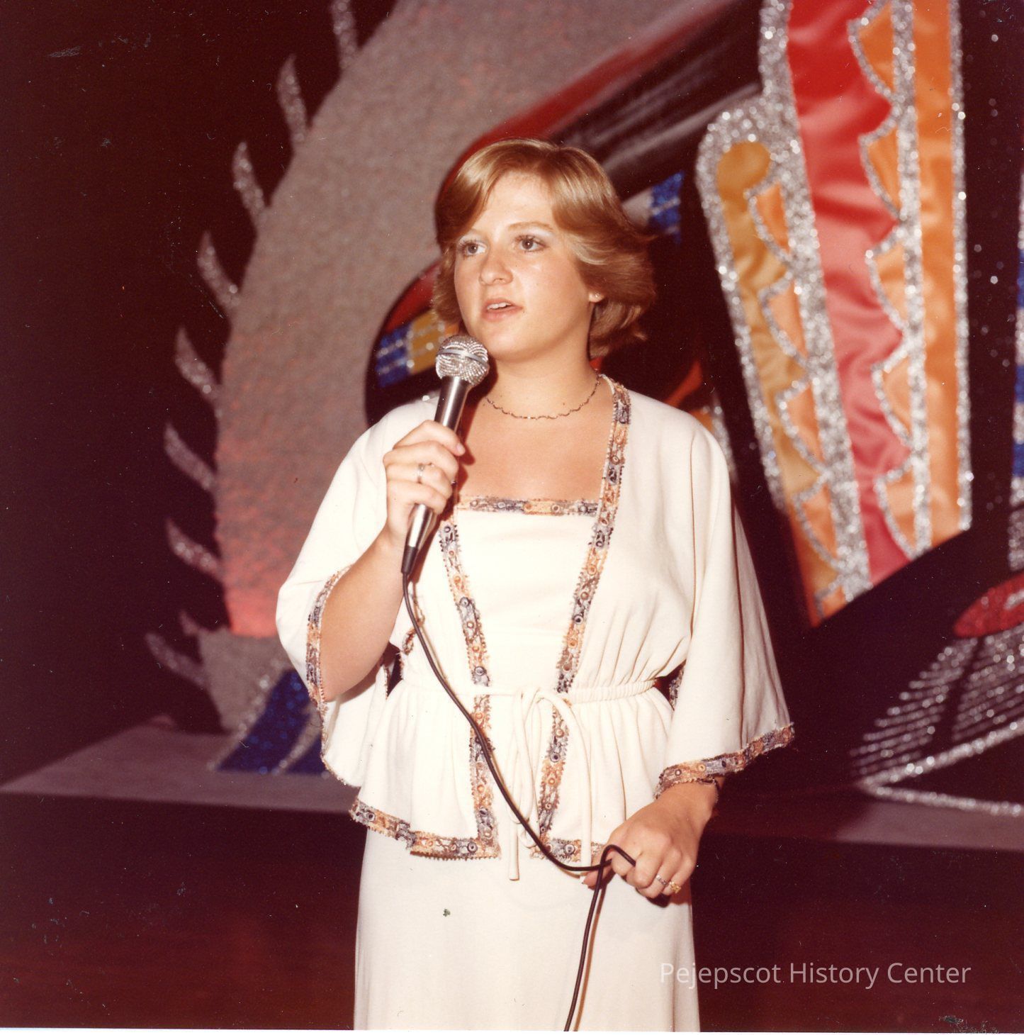 Brunswick Teen Queen Pageant, 1978. Patti Moeller at dress rehearsal practicing her vocal selection.