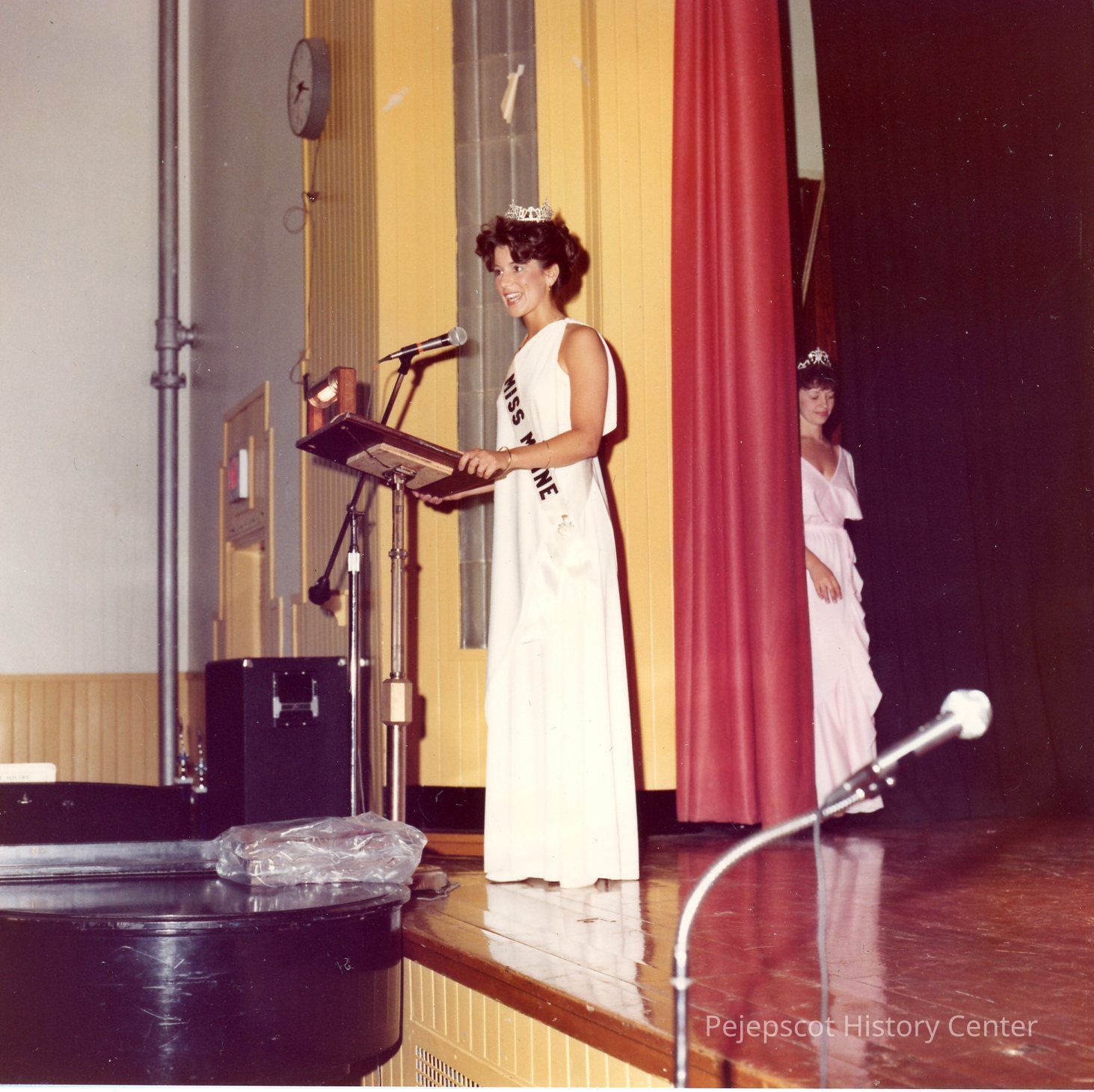 Brunswick Teen Queen, 1979. Miss Maine Valerie Crooker giving her message to the audience at her homecomig from winning the Miss Maine title the week before while Sharon Hinckley is listening from back stage.
