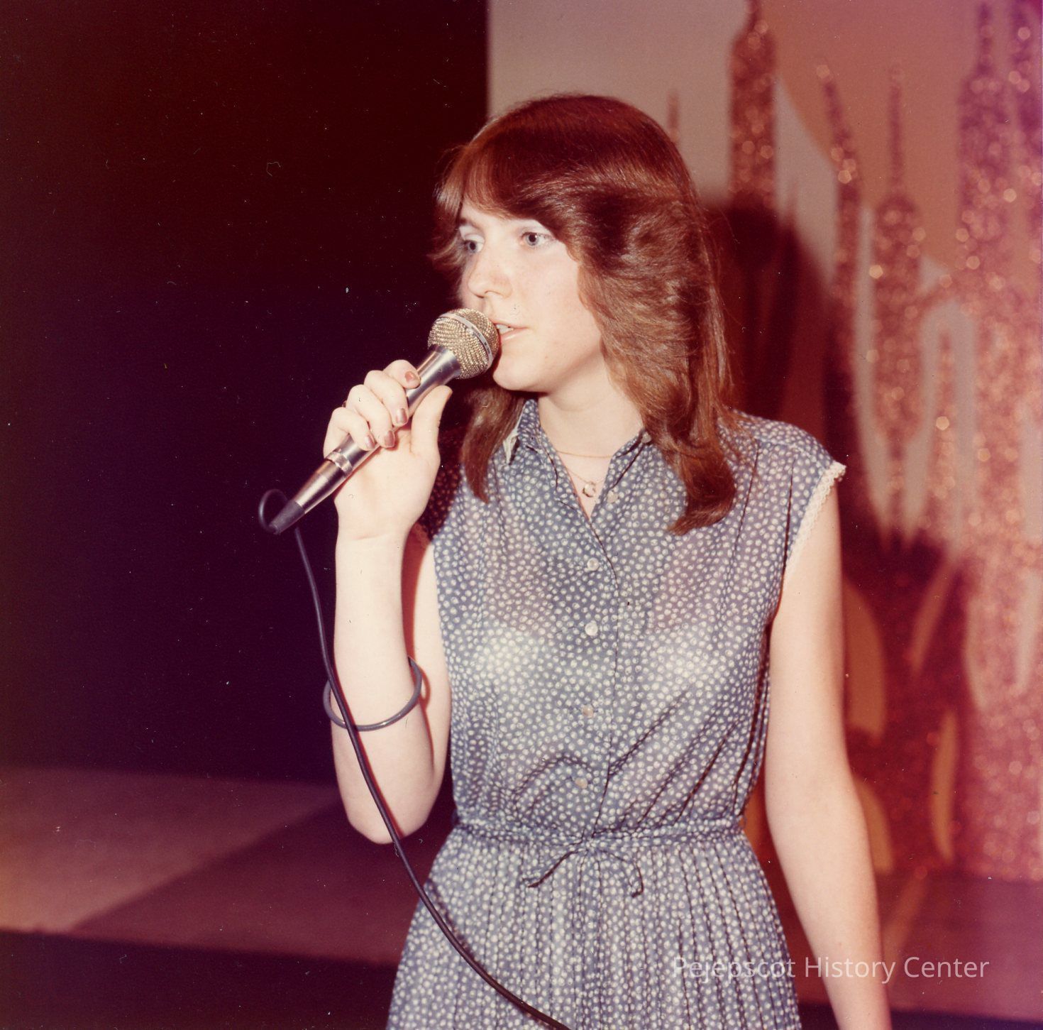 Brunswick Teen Queen Pageant, 1979. Contestant #9, Lucie Morin, singing a popular song for her talent presentation at dress rehearsal.Collection