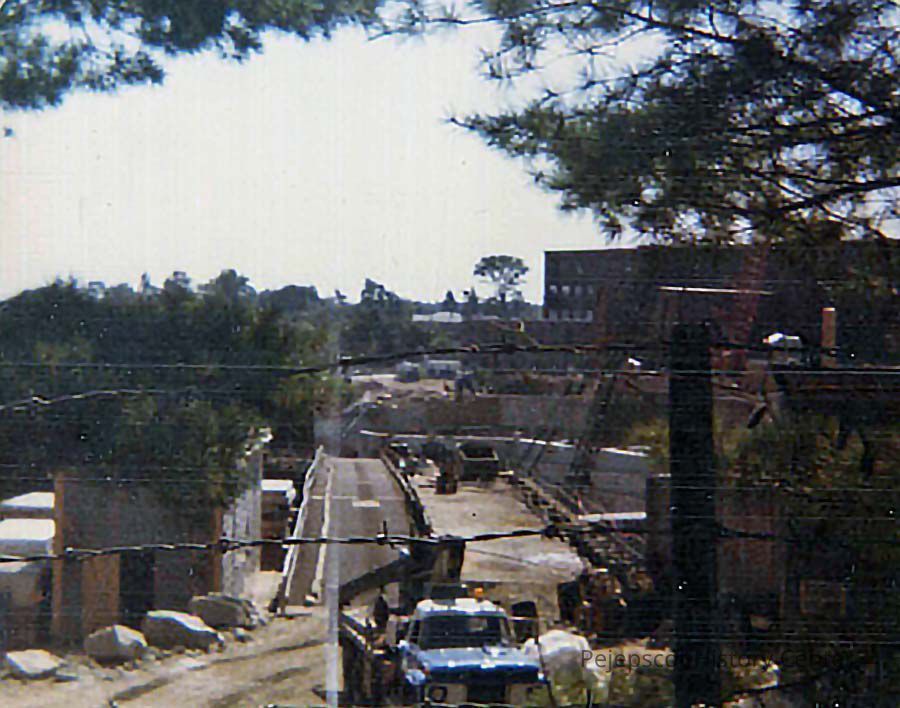 A color photo of a temporary bridge of the dam construction site from the Brunswick side. Undated