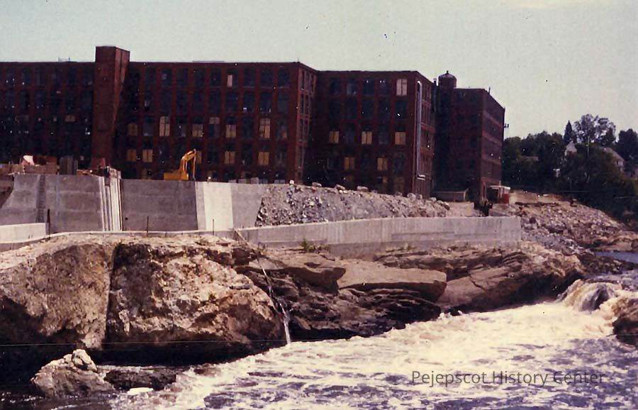 A color photo of the temporary dam above the generating construction. Undated