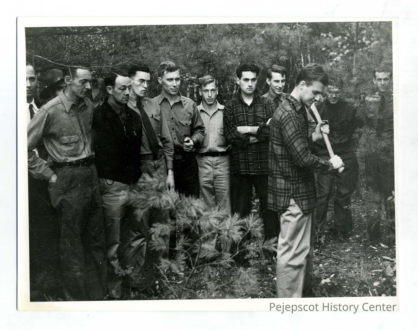 Ten men, possibly Boy Scouts, stand in the woods watching a man demonstrate how to use an axe. Ulmont Nickerson is the third man from the right; Martin Leonard is the fourth; and Joseph Labeau Jr. is the seventh man from the left. Undated