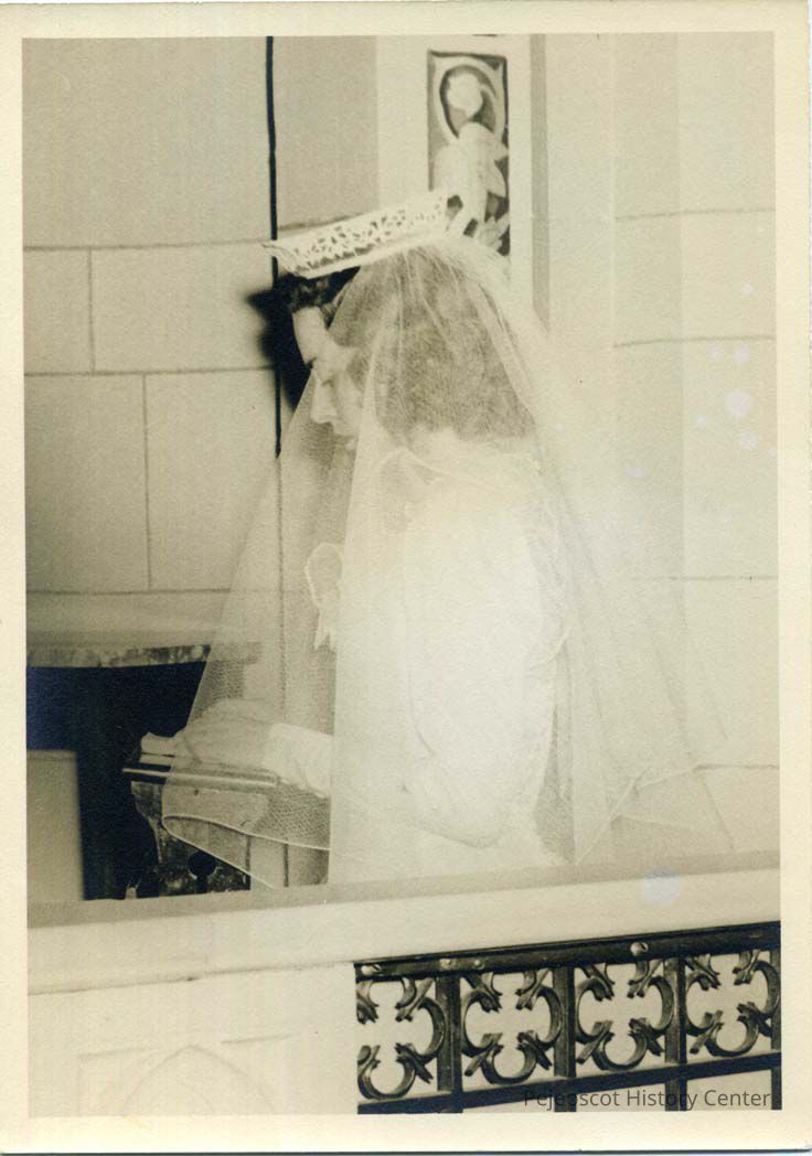 Louriette M. Anne Tetreault pictured alone in St. John's Church either before or after her wedding to Lawrence Bernard Caron. 06/28/1947
