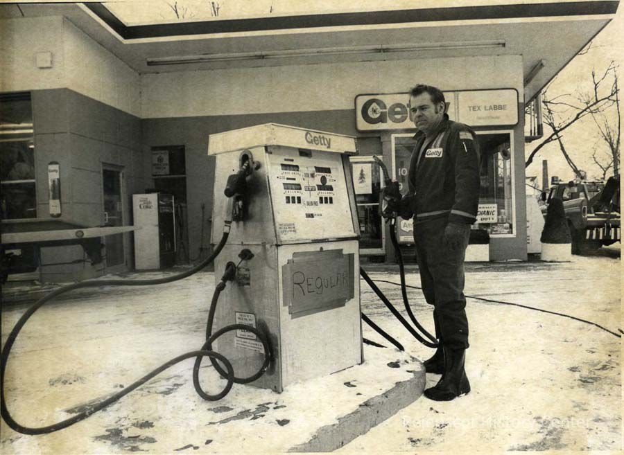 An undated black and white photograph of Tex Labbe at his gas station, Tex's Getty, in Topsham, Maine.