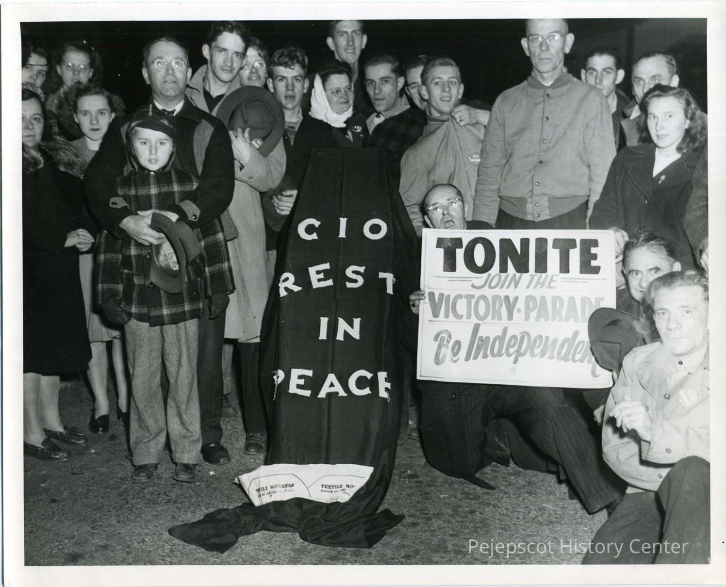 A group of people are standing outside at night. They are holding two signs. One reads "CIO rest in peace" with a " Textile Workers Union Independent" banner pinned to the bottom. The other sign reads "Tonight Join the Victory Party Be Independent. The picture includes Aline Boucher, ? Levesque, Gerard Boucher, Clement Shink, Cecile Laffely Belanger, Romeo Belanger, John Smith (Engerske), Jean Boucher, Jean-Marie St. Pierre, Ludger Belanger. UndatedLexicon
