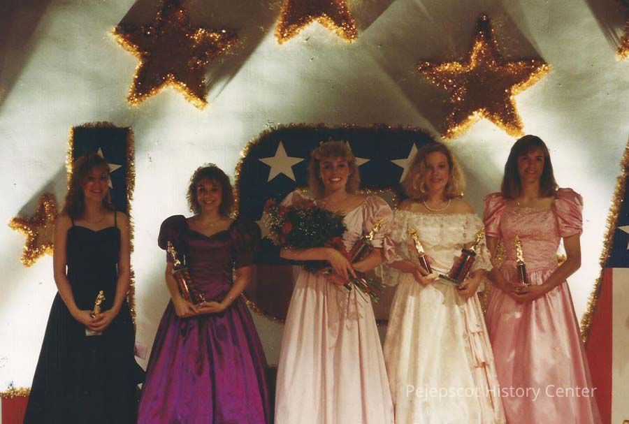 A color photograph of the 1991 Teen Queen participants, Tiffany Barker, 1st runner-up Corrie Pottle, Teen Queen Robin Moody, Miss Congeniality Darby Labbe and Cindy Pomerleau.