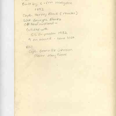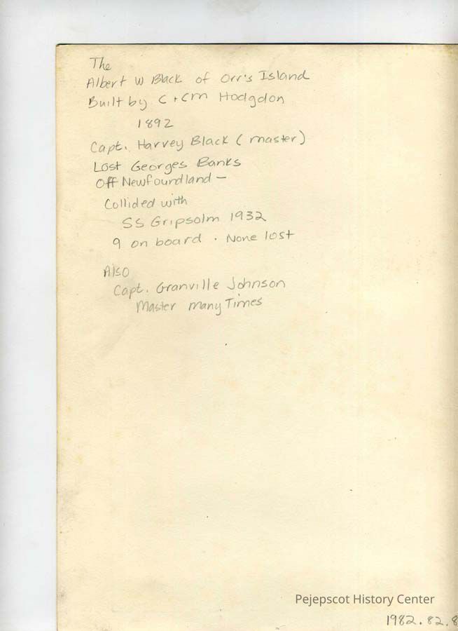 Vessels - Albert W. Black, Vessels - Gripsholm, Sailing ship, Ship, Ship captains - Harvey Black, Ship captains - Granville Johnson, Shipbuilding - Orr's Island, Shipbuilders - C.& C.M. Hodgdon, Shipbuilding, Shipwrecks - Georges Bank, Shipwrecks - Newfoundland, Shipwrecks