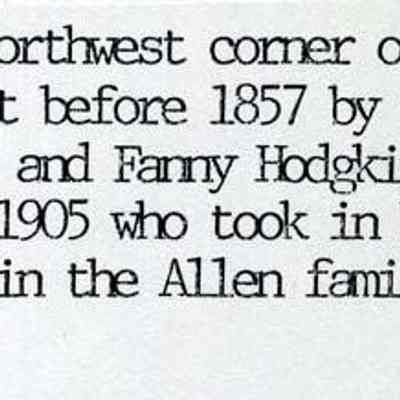A color print copy of the Allen House at the corner of Route 123 and Lookout Point Road. It was built before 1857. See back of photo for more info. UndatedCollection