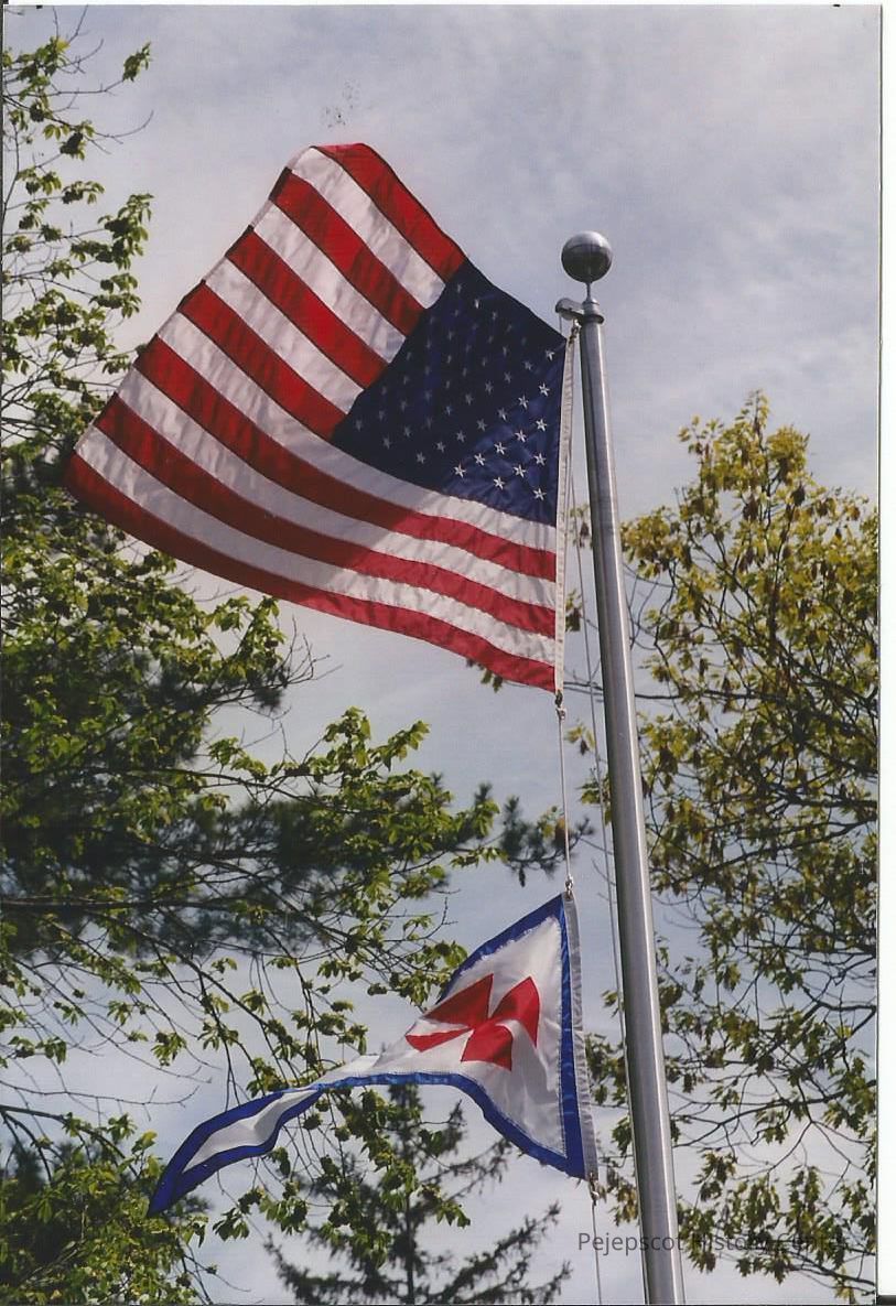 A color photograph of the American flag and a Maltese cross banner. Undated.