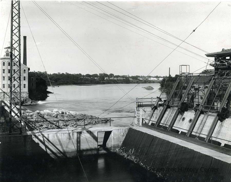 A B/W photograph of the Androscoggin River looking from the power station on the Brunswick side to the paper mill on the Topsham side. Undated