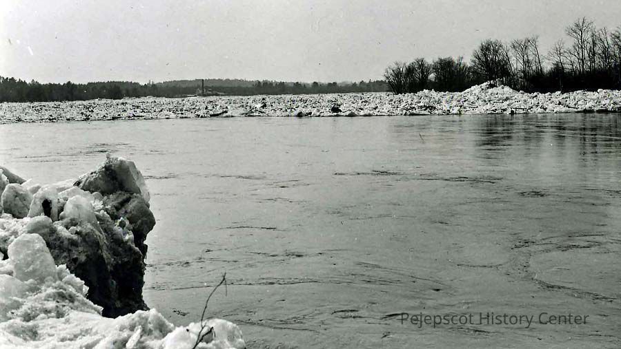 A B/W photograph of ice in the Androscoggin River during the flood of 1936.