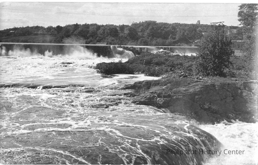 A B/W picture postcard view of the Androscoggin River Falls. The photo seems to be taken from the Frank J. Wood bridge from Topsham, ME. Undated.