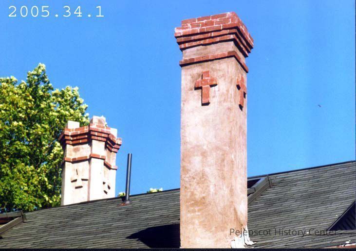 A color photographic view of the Chamberlain House chimneys taken from the back. it shows the chimney with the religious cross in front and the center chimney which had been castellated and decorated with a band line above the red Maltese cross on each face in the back ground.