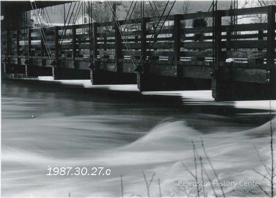 A B/W photograph of the Black Bridge, Brunswick/Topsham, Maine. Flood of 4/1/1987.