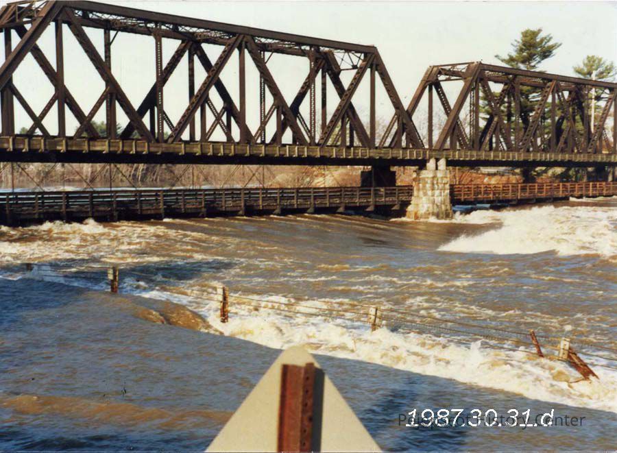 A color photograph of the Black Bridge and the rising flood waters. April 1987. Brunswick, Maine.