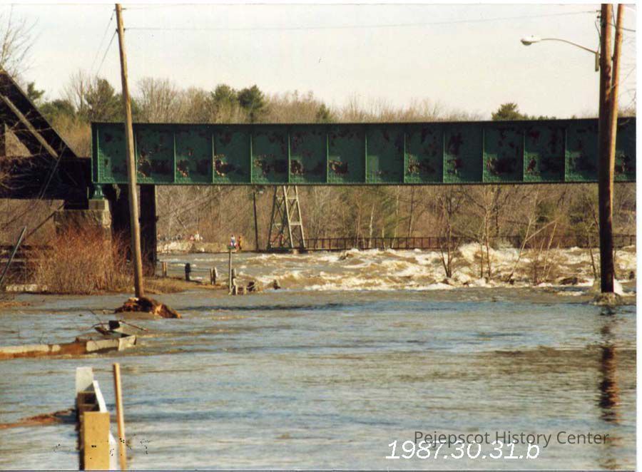 A color photograph of the Black Bridge, Brunswick/Topsham, Maine. At this time most of the road bed portion is under water. The Swinging Bridge can be seen in the back ground. Flood of April 1987.