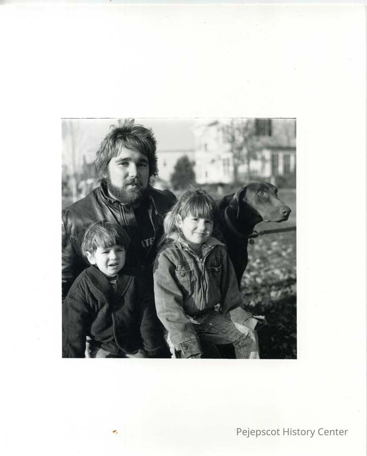 A black and white photograph of Justin, Amy and Scott Bloodgood and their dog, who resided at 18 Cushing Street, Brunswick. The photograph was taken on the Brunswick Mall.