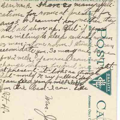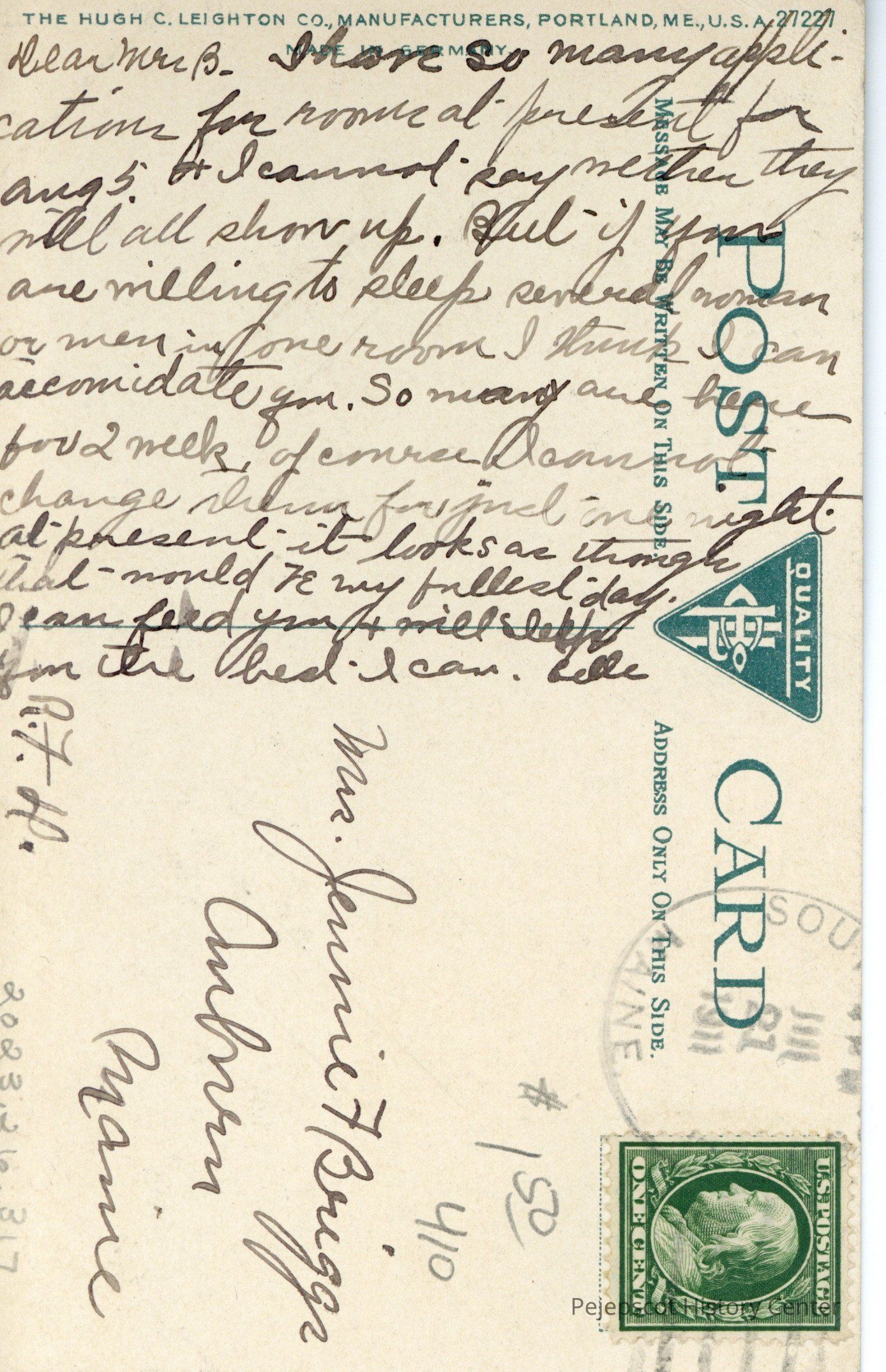 Dear Mrs B. I have so many applications for rooms at present for Aug5. and I cannot say wether [sic] they will all show up. But if you are willing to sleep several women or men in one room I think I can accomidate [sic] you. So many are here for two week, of course I cannot change them for just one night. At present it looks as though Wed would be my fullest day. I can feed you & will sleep you the best I can. Belle