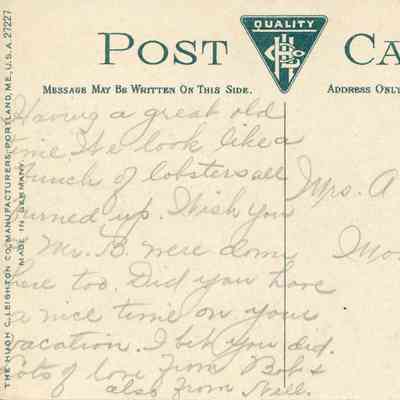 Having a great old time. We look like a bunch of lobsters all burned up. Wish you & Mrs. B. were down here too. Did you have a nice time on your vacation. I bet you did. Lots of love from Bob & also from Shell.