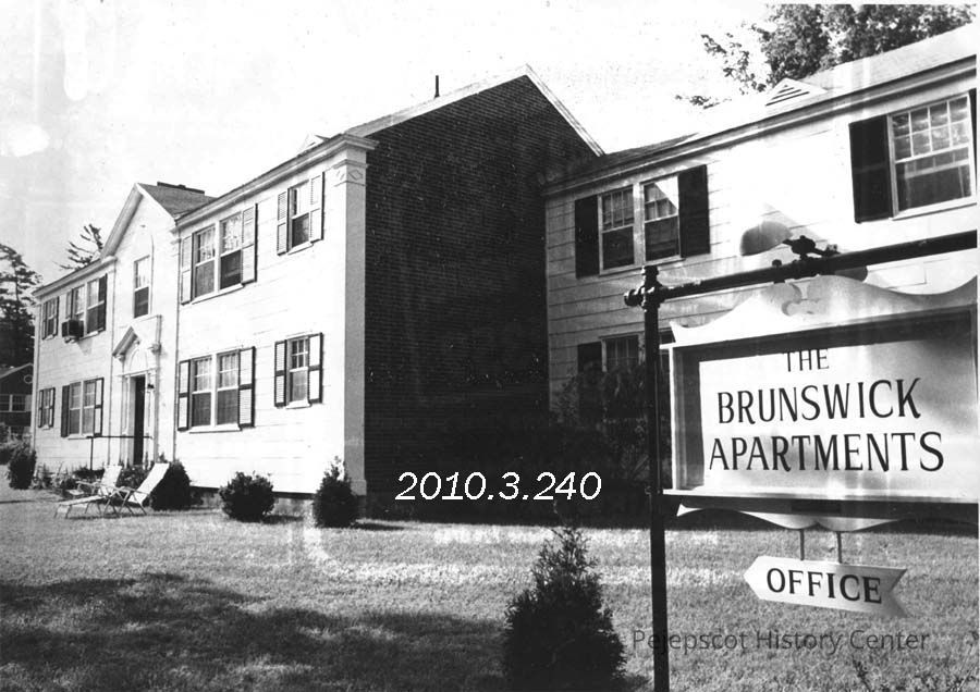 A B/W photograph of the Brunswick Apartments located on upper Maine Street. which were purchased by Bowdoin College. Photo published 6/13/1973. Undated