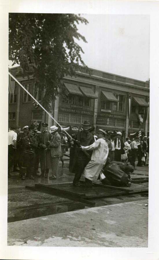 A B/W photograph of the Brunswick Bicentennial parade. Water pump display in front of the Tondreau Bros. Market on Maine Street. Dated 1939.