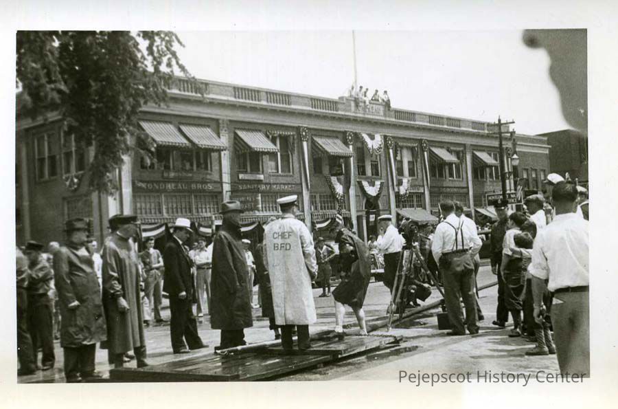 A B/W photograph of the Brunswick Bicentennial parade. Firemen are pictured in front of the Tondreau Block on Maine Street. Dated 1939.