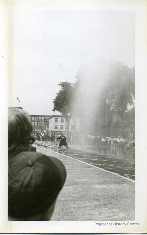 A B/W photograph of the Brunswick Bicentennial parade. Cabot Mill is visible in the background. Dated 1939.