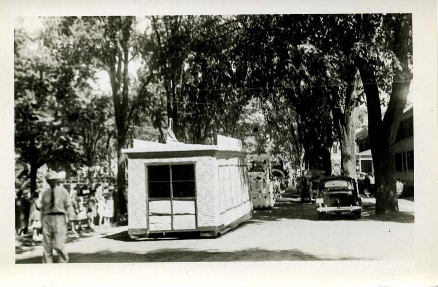 A B/W photograph of the Brunswick Bicentennial parade. Floats can be seen moving down the street. Dated 1939.