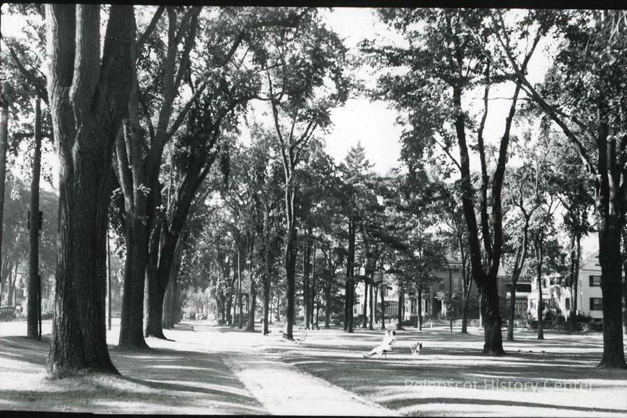 A B/W photograph of The Brunswick Mall, Brunswick, ME. The Skolfield Whittier House and the house of OneSixtyFive Maine can be seen in the background. There are some people sitting on the benches in view.