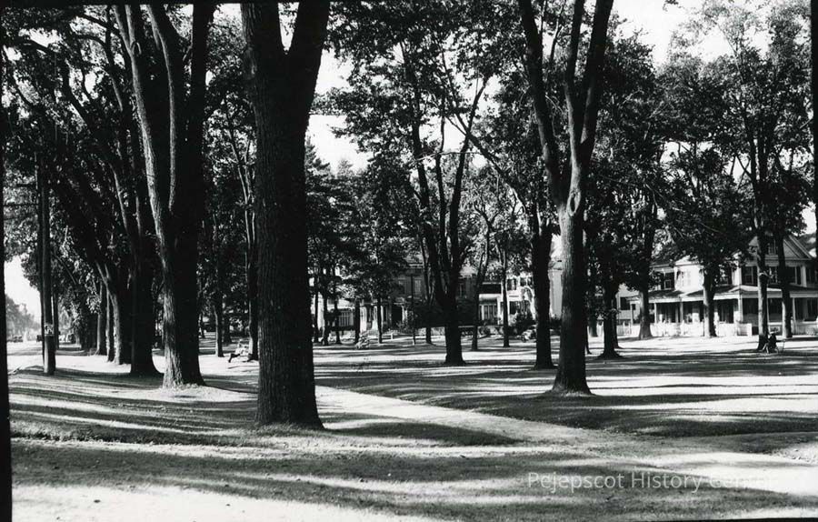 A B/W photograph looking north on The Brunswick Mall, Brunswick, ME. The Skolfield Whittier House can just be seen in the background.