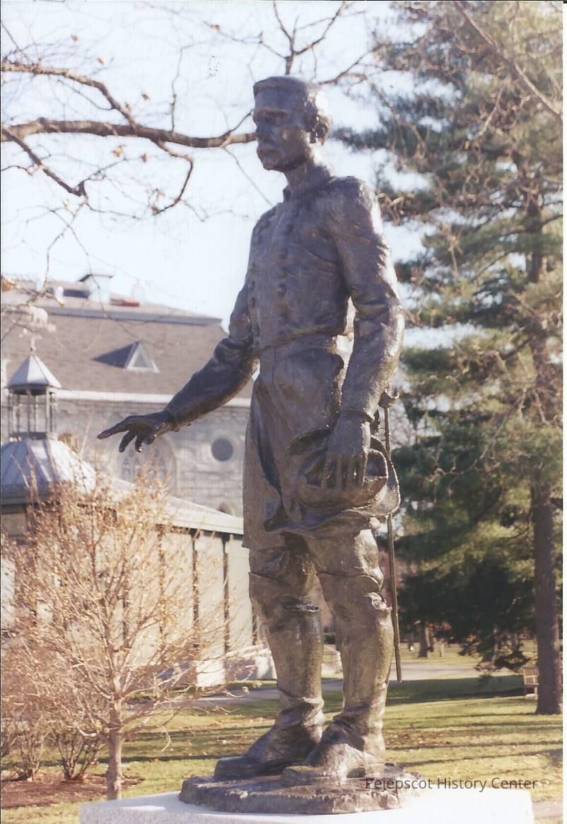 A color photograph of a side view of the Chamberlain statue with Bowdoin College in the background. Written on the back is, "Chamberlain Statue, Brunswick (ME)." With the date written and then crossed out. Dated 05/31/2003.