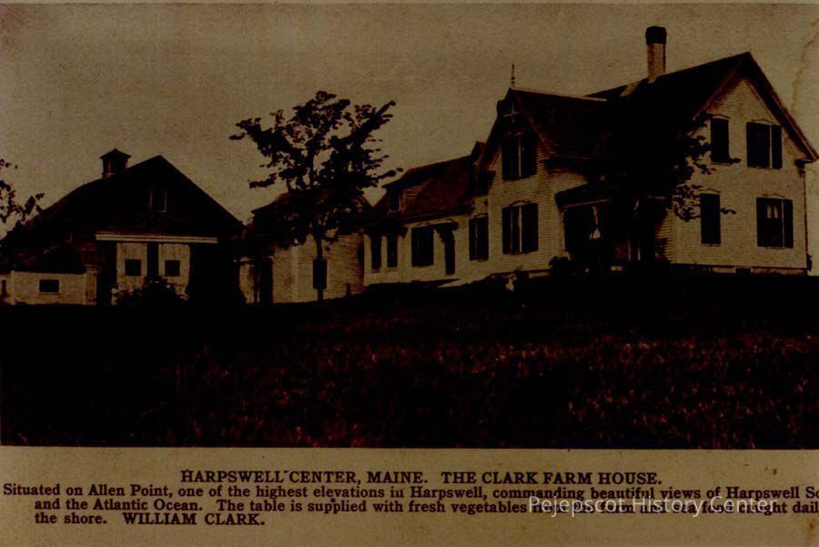 A color print copy of the Clark Farm House, Harpswell Center, on Allen Point. It is on the highest land in Harpswell. For more info see back of photo. UndatedCollection