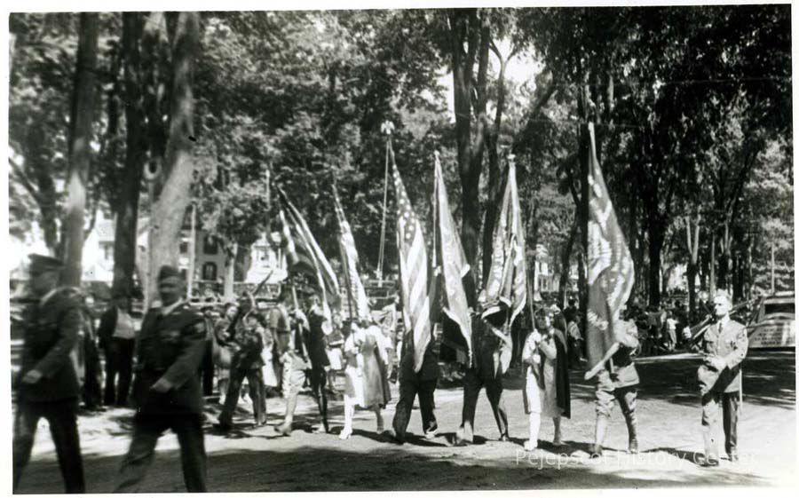 A B/W photograph of the color guard and flags at the Brunswick Bicentennial parade. Dated 1939.