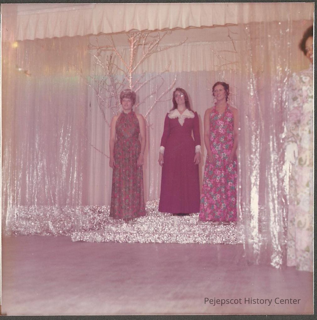 1964 Teen Queen Kristina Warming, 1972 Teen Queen Agnes Racine, and Teen Queen Sue Valore standing after the production number for gown competition.Collection