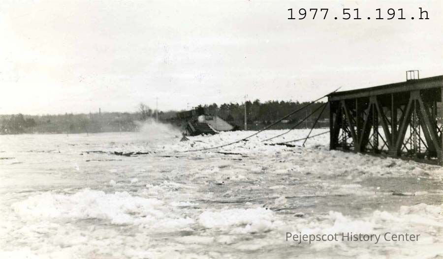 A B/W photograph of the destroyed railroad bridge over the Androscoggin River during the 1936 flood. Printed on the front of the postcard it reads "Flood Scene, Brunswick, Maine, March 14-20, 1936".Lexicon
