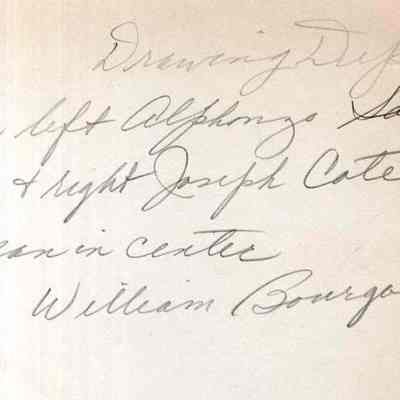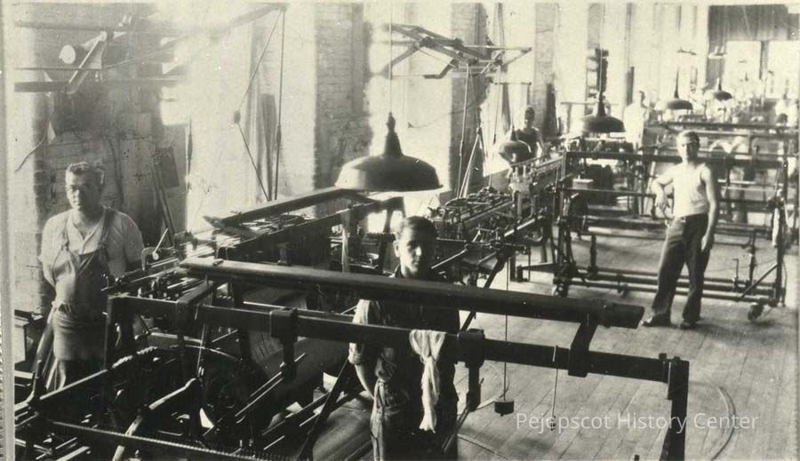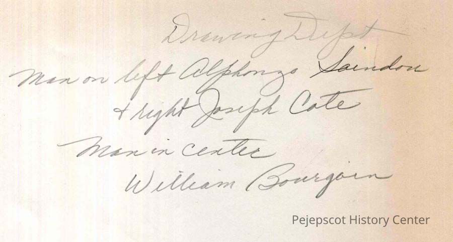 A B/W photograph of the "Drawing Dept." The people are l. Alphonze Saindoin, c. William Bourgoin and r. Joseph Cote. Cabot Mill, Brunswick, Maine. Undated.Collection
