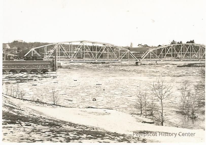 A B/W photograph of the Frank J. Wood Bridge during very high waters. Looking at it from down stream on the Brunswick, ME, side. Undated.Lexicon