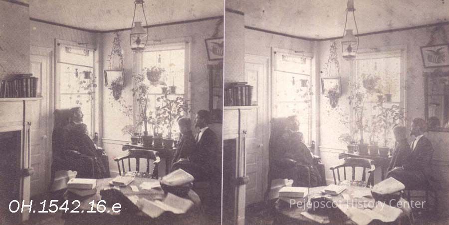 A B/W stereo view of the Furbish House at 10 Cumberland Street, Brunswick, ME. It shows the sitting room. Undated
