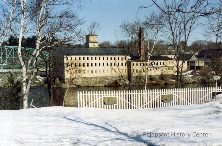A color photograph of the former Bowdoin Mill of the Pejepscot Paper Company, Main Street Topsham. Undated